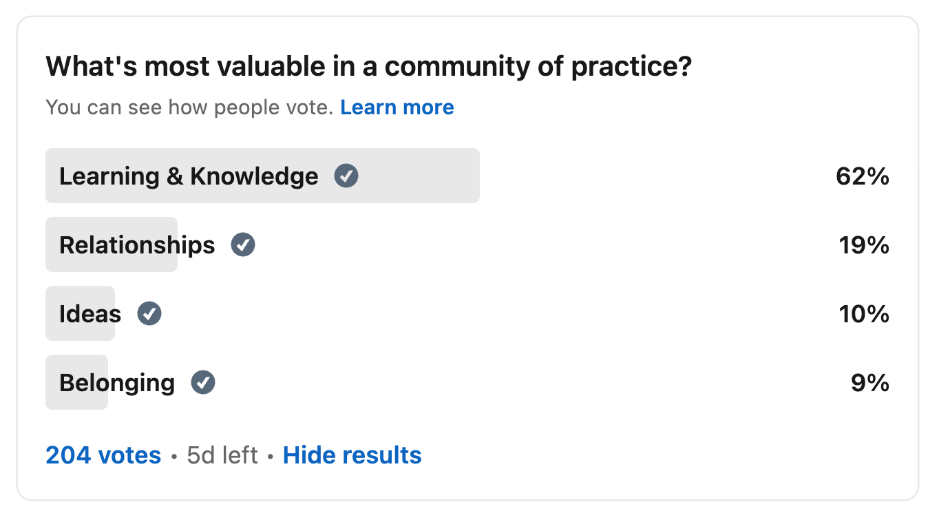 This poll below is a good example. People come for the knowledge and learning, the relationships aren't usually a priority. But we can build in care and relationship building with how we learn. I'm not saying no to relationships, I'm saying lets actually be realistic and find balance with what we can achieve.