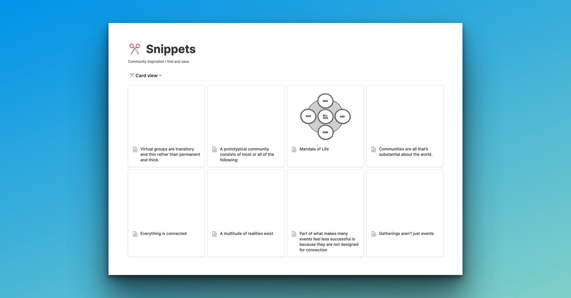 Alongside this, the feedback I've been given time and time again is that I help people see things in a different way. I find ways to talk about things. Create new ideas, names, frameworks and perspectives that help people see how community can be. And perhaps a contributing factor is that I also don't have time for community bullsh*t and the things that don't help community truly move forward.