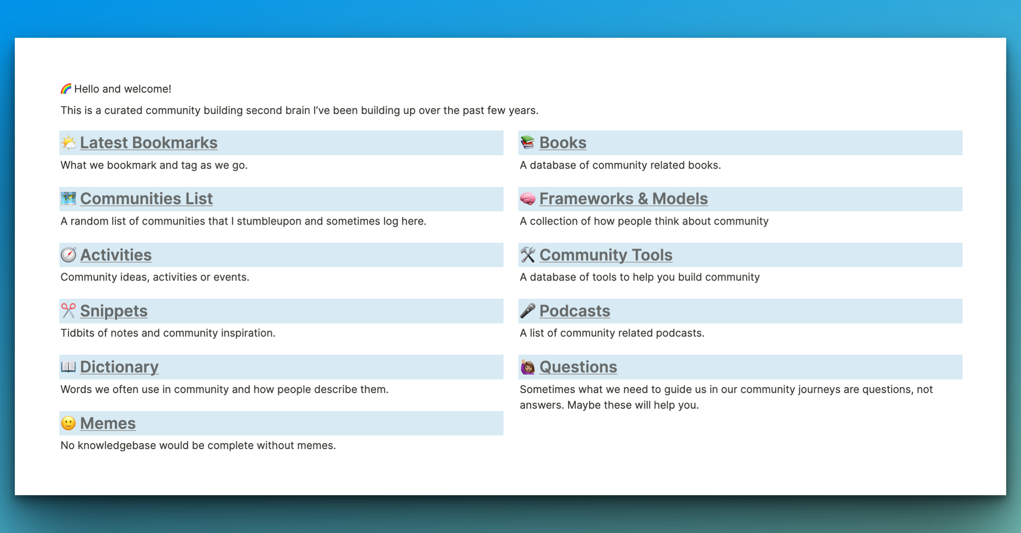 There is the Knowledgebase that is full of ideas, resources, snippets, podcasts, books...a lot of this knowledgebase is actually where I save everything from the Roundups.