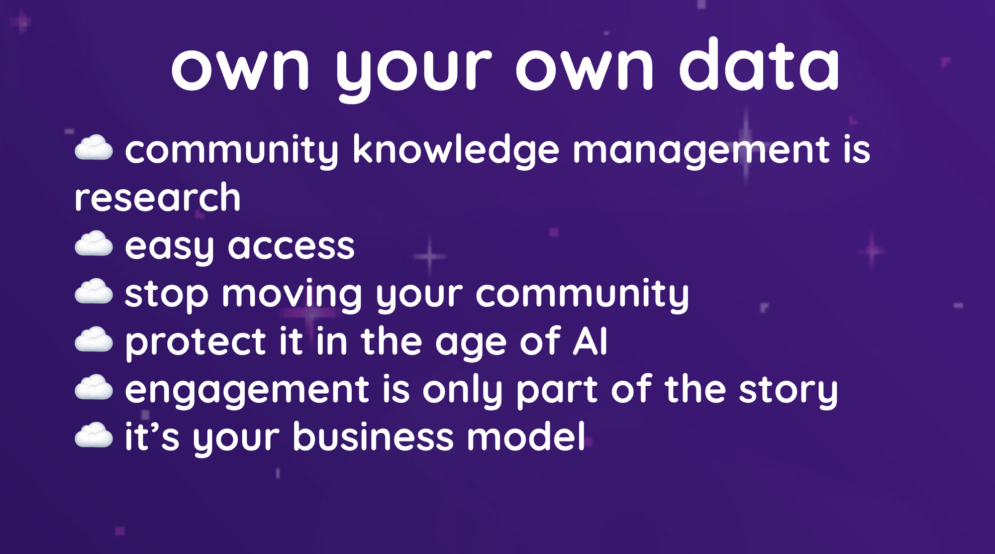 To me, owning your own data is only meaningful when you have real control and flexibility around it. Many of the community platforms say you own data, and you do, but migrating away from communities is still a royal pain in the butt, if not impossible to do well from a tech perspective, let alone a UX one.