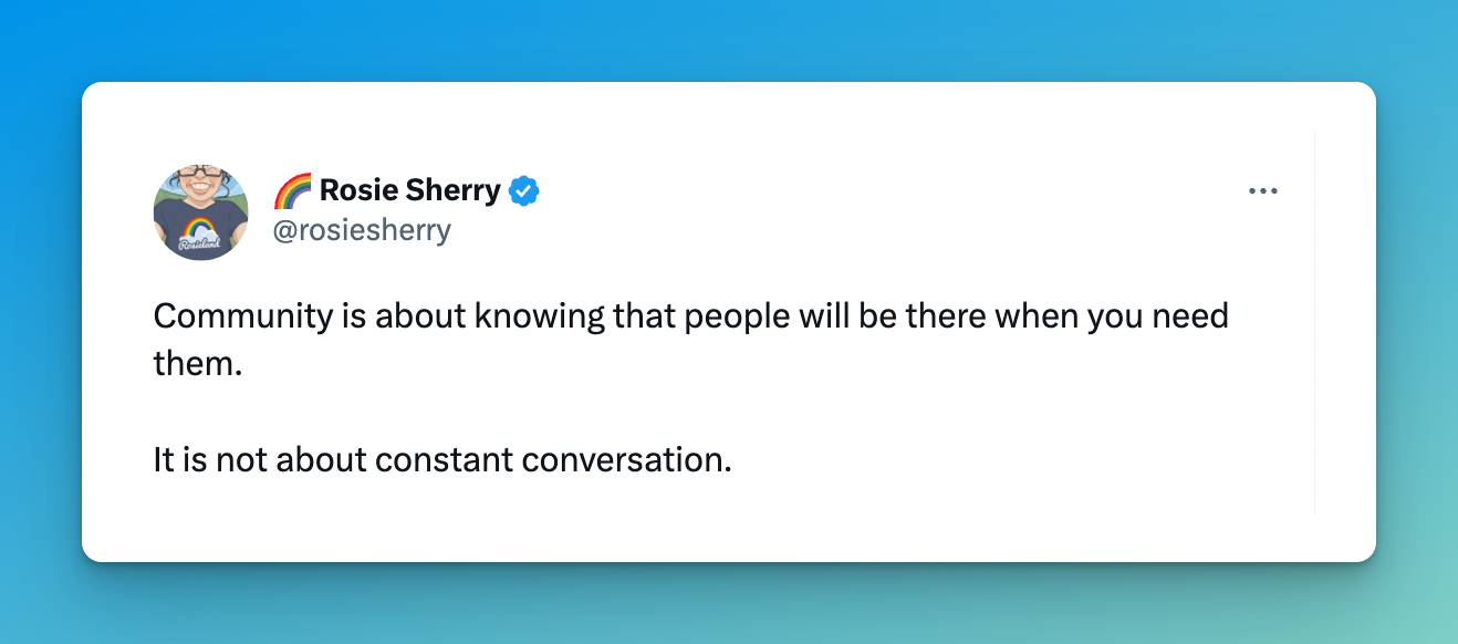 - a bias to action: people join communities to find a way to progress, what are you helping progress?