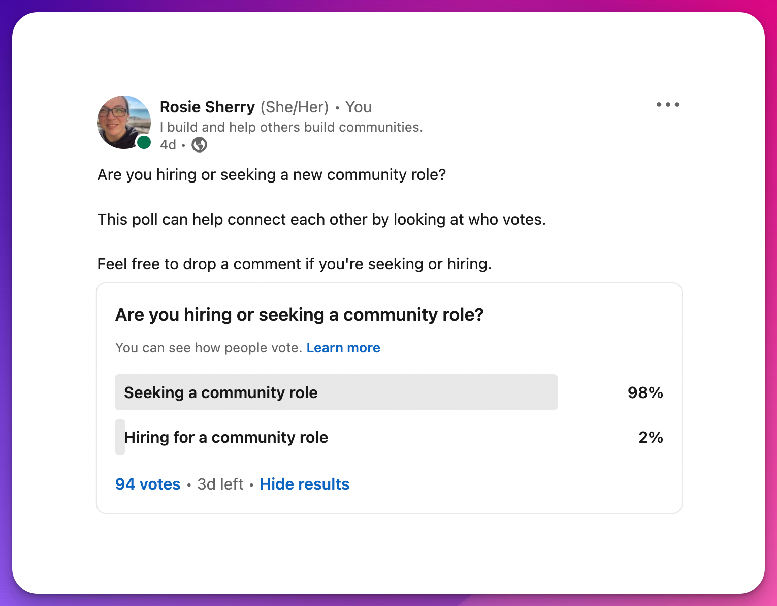 Then this LinkedIn post is for you. Obviously, we'd love to hear from more people who are hiring! 😢